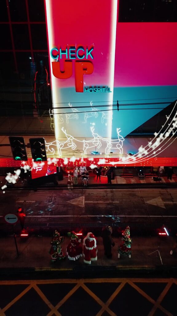 A programação contou com apresentações de personagens natalinos, presença do Papai Noel e duendes, música ao vivo, além da montagem de um cenário temático com neve artificial para registros fotográficos, tendo como pano de fundo a nova fachada do Check Up Hospital, entregue em 2025 como um dos grandes projetos estruturais da instituição.