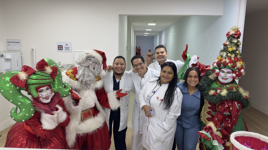 Os personagens natalinos também realizaram interações com pacientes internados, sempre com toda a segurança garantida pelas equipes assistenciais, além de visitarem colaboradores que atuam em áreas técnicas, como o Laboratório, e que não puderam comparecer ao cenário natalino.